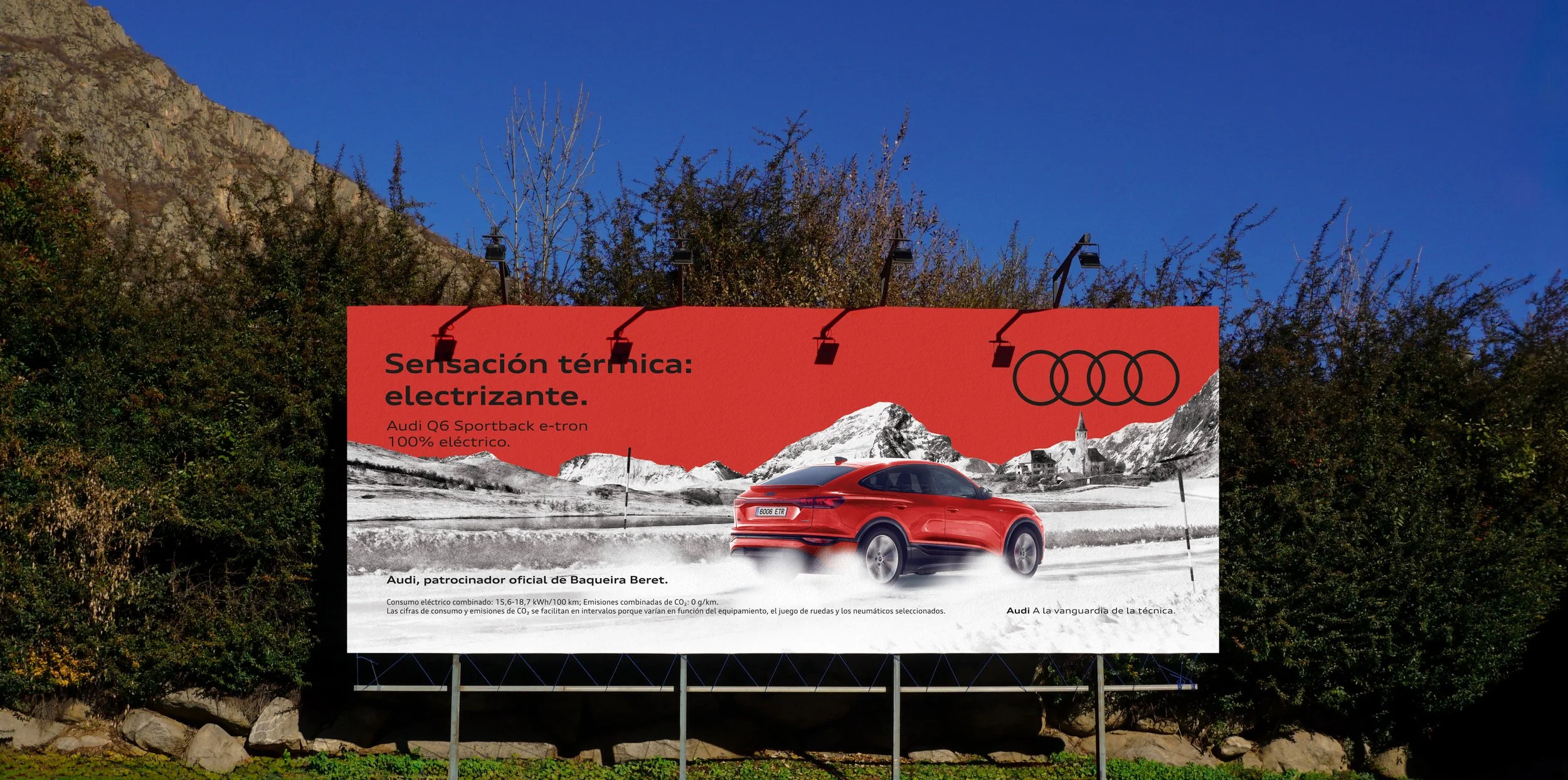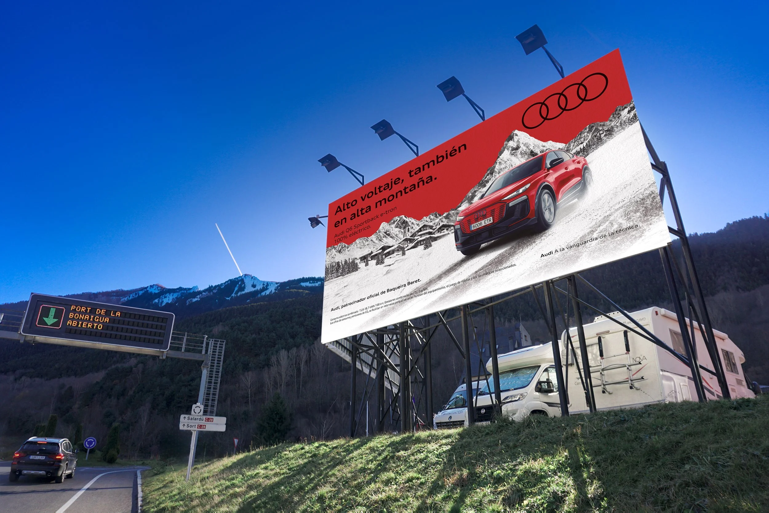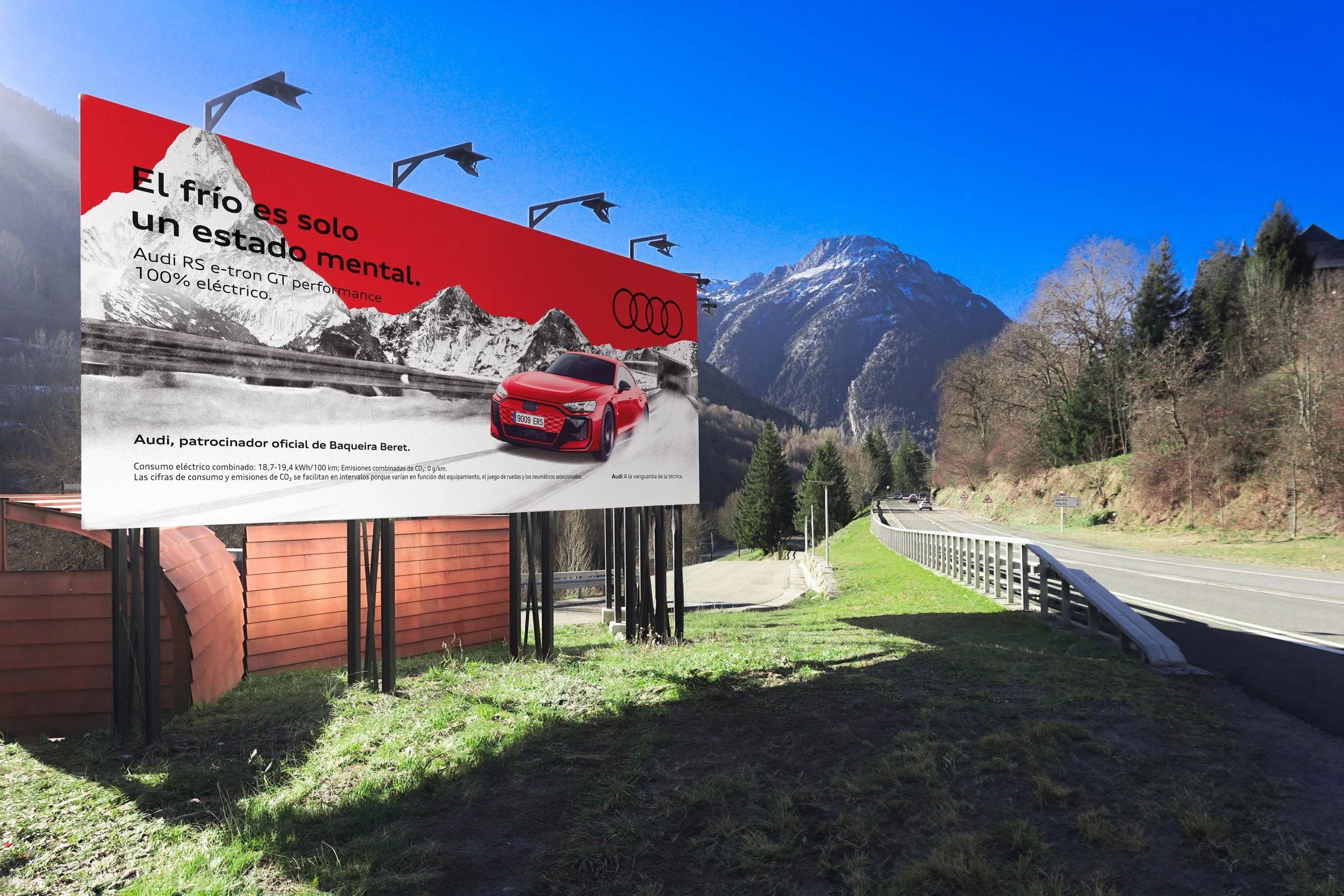 A combination that, together with Audi’s red tone, gives it strong presence and prominence along the entire billboard route from Vielha to Baqueira Beret, creating an impactful visual journey that blends innovation, nature, and design.